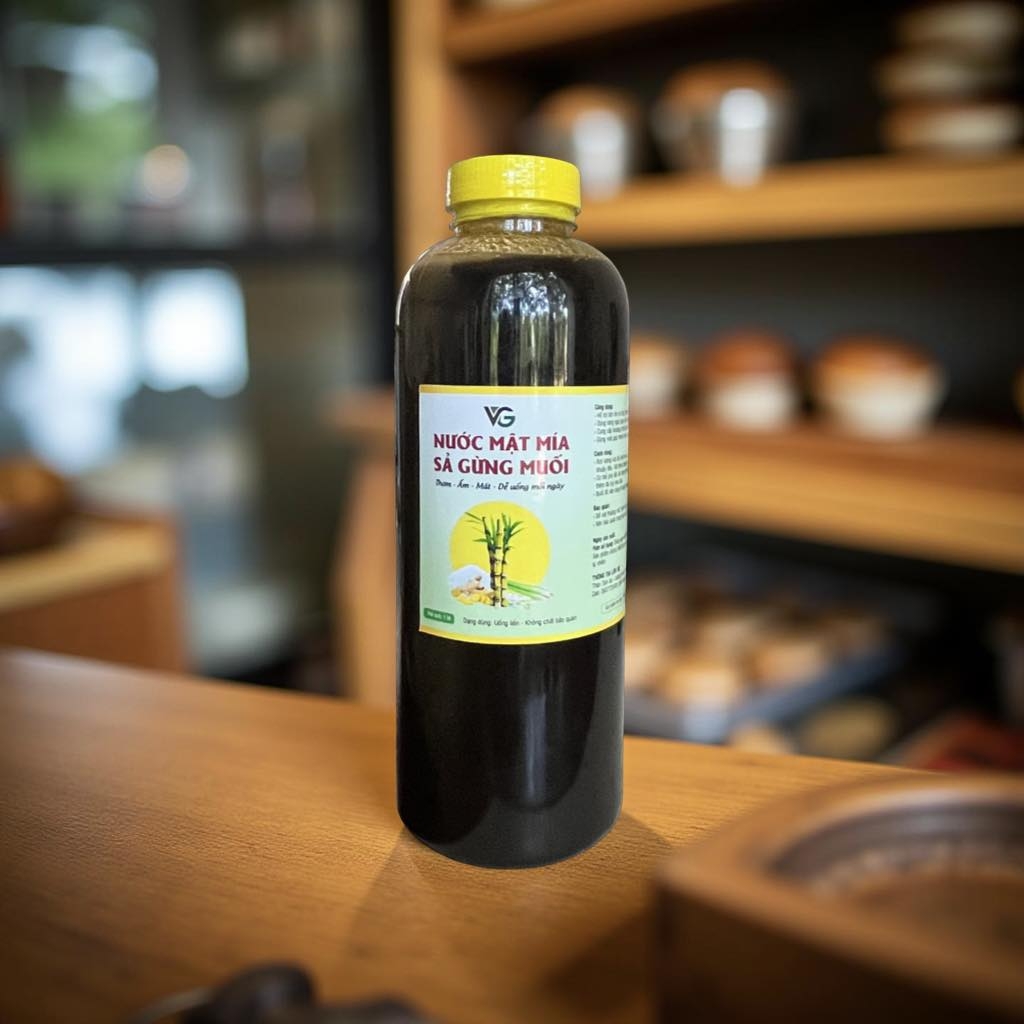 Mật Mía Sả Gừng Muối VG được nấu thủ công từ mật mía bếp củi, kết hợp gừng già – sả tươi – muối biển, tạo nên hương vị ngọt dịu – thơm nồng – hậu mát.